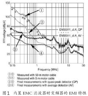 通常情況下,配有內(nèi)置干擾抑制器件的變頻器的最大運行線纜長度是5 m。帶有內(nèi)部干擾抑制器件的測試曲線如圖1所示。被測變頻器帶有內(nèi)部干擾抑制器件,電機線纜長度為5 m或50 m,電機功率為11 kW。在電機線纜長度為50 m的情況下,發(fā)生超過限值的情況。測試表明在滿足這些條件下的最大傳導(dǎo)發(fā)射滿足EN55011/Class A 的要求。然而,如果變頻器使用更長的線纜,那么電源線上的傳導(dǎo)干擾將會增加,變頻器內(nèi)置濾波器將不能保證足夠的噪聲抑制。由于屏蔽線纜本身的高寄生電容所產(chǎn)生的共模電流也將隨著線纜長度而增加,這些電流將導(dǎo)致內(nèi)部濾波器的共模扼流圈飽和,因而EMC 的要求將很難被滿足,配置外置濾波器成為了必要條件。