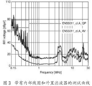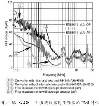 乍看之下,在頻率從幾百kHz 到3 MHz 的范圍內(nèi),配有內(nèi)置線圈的測試曲線令人驚訝。這是因為共模扼流圈,其電感量由其鐵氧體材料決定,不僅抑制共模干擾,而且具有非常低的漏感(漏感是由于部分磁場穿過空氣而不是鐵氧體介質(zhì)所產(chǎn)生的)。這部分漏感并沒有受到線圈飽和的影響而繼續(xù)存在,但是它對其他因線圈飽和而超過限值的頻段幾乎毫無幫助。如果同一個變頻器使用同樣型號為BAOF的濾波器,但是去掉變頻器內(nèi)部扼流圈,結(jié)果顯示就如圖2,這樣更容易滿足限值。