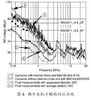然而,變頻器帶動兩個并聯(lián)電機(此例子中是一個功率為7.5 kW和11 kW 的電機),每個電機以25 m長的線纜連接,這種配置要比單個電機、50 m長線纜的配置的要求更高,兩個電機并聯(lián)的測試曲線如圖4所示。安裝外置BAOF濾波器,是配有和去掉內(nèi)置干擾抑制器件的對比測試曲線,將圖2 和圖4進行對比,由圖可知,線纜長為25 m 的兩個電機產(chǎn)生的干擾明顯高于線纜長為50 m的電機。這種現(xiàn)象同樣可以在去掉變頻器內(nèi)部線圈后的對比測試中重現(xiàn)。如果使用低成本濾波器BAOF,可以實現(xiàn)低于限值的目標(biāo),即使在內(nèi)部線圈被去掉的情況下,但是余量相對于單個電機50 m線纜的情況要明顯小了很多。