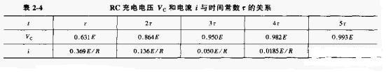 式中:e-自然對數;t-時間。從公式中不難看出,充電過程中Vc和i是按指數規律變化的。而充電的快慢取決于電阻和電容的乘積,因此稱RC為時間常數r,即r=RC。如果R和C的的單位取歐姆和法拉,則r的單位為秒。 根據公式計算在不同時間內的Vc和i,其結果見表2-4。從表中可以看出,r越大充電越慢。當t=3r時,Vc=0.95E;當t=5r時,Vc=0.993E;一般認為當 t=(3-5)r時,電容器上的電荷已被充滿。