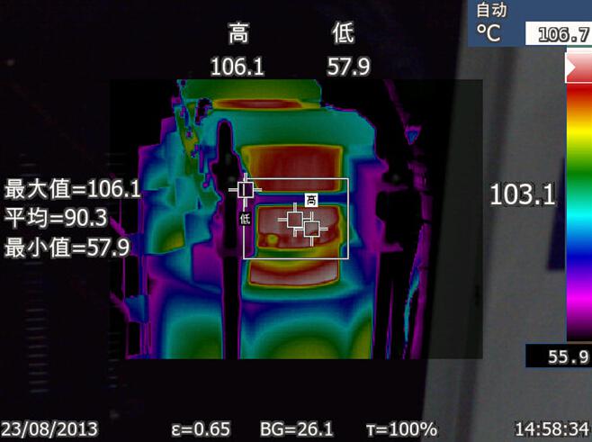 一、情況簡(jiǎn)介 110kV十區(qū)變電站新裝兩套容量(1500+1500)kvar的電容器組,共分4組,每組容量1500kvar,選配電容器型號(hào)PhMKPM-6.6/1/500,單體容量500kvar,電容量33.17μF,額定電壓12/ kV,額定電流24.06A。選配電抗器的電抗率為6%,型號(hào):R7PM 10.0/3/1500,Qn90 kvar,電感量18.38mH,共4臺(tái)。2013年8月16日投運(yùn)1組1500kvar電容器組運(yùn)行一周后,電抗器噪音增大,紅外成像測(cè)溫顯示線圈和鐵芯溫度升高到106.1℃,紅外成像測(cè)溫圖見圖1。為避免電抗器燒損事故,遂將并聯(lián)電容器組退出運(yùn)行。分析認(rèn)為電抗器發(fā)熱可能由以下原因引起:A電抗器質(zhì)量存在設(shè)計(jì)和工藝上的缺陷。B電網(wǎng)諧波引起。