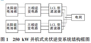 以由兩臺125 kW 三相逆變器并機(jī)組成的250kW 光伏逆變系統(tǒng)為例, 其常用的結(jié)構(gòu)框圖如圖1所示。其中三相逆變電路采用多電平逆變拓?fù)洌瑸V波器采用LCL 型濾波器,為了保證濾波器有足夠的零序電抗器,前級濾波電抗器需要采用3 個獨(dú)立的單相鐵硅粉芯電抗器組成;后級濾波電抗器由于電流諧波較少,可以采用價(jià)格相對便宜的三相硅鋼電抗器[6]。