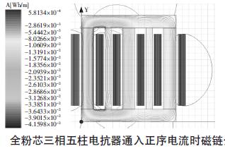 3、三相五柱磁路仿真 使用Maxwell 對三相五柱電抗器進(jìn)行建模仿真。當(dāng)電抗器的磁芯都是由鐵硅粉芯組成時,其磁鏈分布如圖4所示。由圖4可以看出,在鐵芯柱與鐵芯軛的接縫處存在較多的旁路磁通,而且這些旁路磁通有一部分直接與繞組鋁箔相交,這些磁鏈會在鋁箔內(nèi)形成電阻很小的渦流,引起很大的線圈損耗。為減小旁路磁通的影響,將上下顎換成B23P090 取向硅鋼片,對其進(jìn)行仿真,其磁鏈分布如圖5 所示。由圖可見,即使在電抗器繞組中通入零序電流,氣隙處的旁路磁通依然很小,減小旁路磁通引起附加損耗的同時減少了電抗器的漏磁,防止對周邊的器件產(chǎn)生電磁干擾。